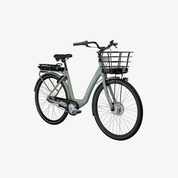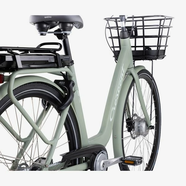 Denna cykel har ett pakethållarbatteri på 400 wh som du kan plocka ur cykeln och ta med dig. Din återförsäljare kan hjälpa dig att låsa batteriet så att det bara fungerar med din cykel och ställa in cykelns körstil så att den driver på ett sätt som passar din cykling. Allt är snyggt inbyggt i en 7-växlad damcykel av modernt snitt, med lågt insteg, fotbroms bak och skivbroms fram. Det ingår också ett styrlagerlås som gör att styret kan hållas upprätt vid parkering även om korgen är fullastad. Displayen på styret håller dig uppdaterad när du och cykelns batteri sitter i pakethållaren, som dessutom har en smart funktion där du enkelt klickar av och på en väska eller korg. Cykelkorg med anpassad tygväska framtill ingår, liksom stöd, godkänt ramlås och belysning.